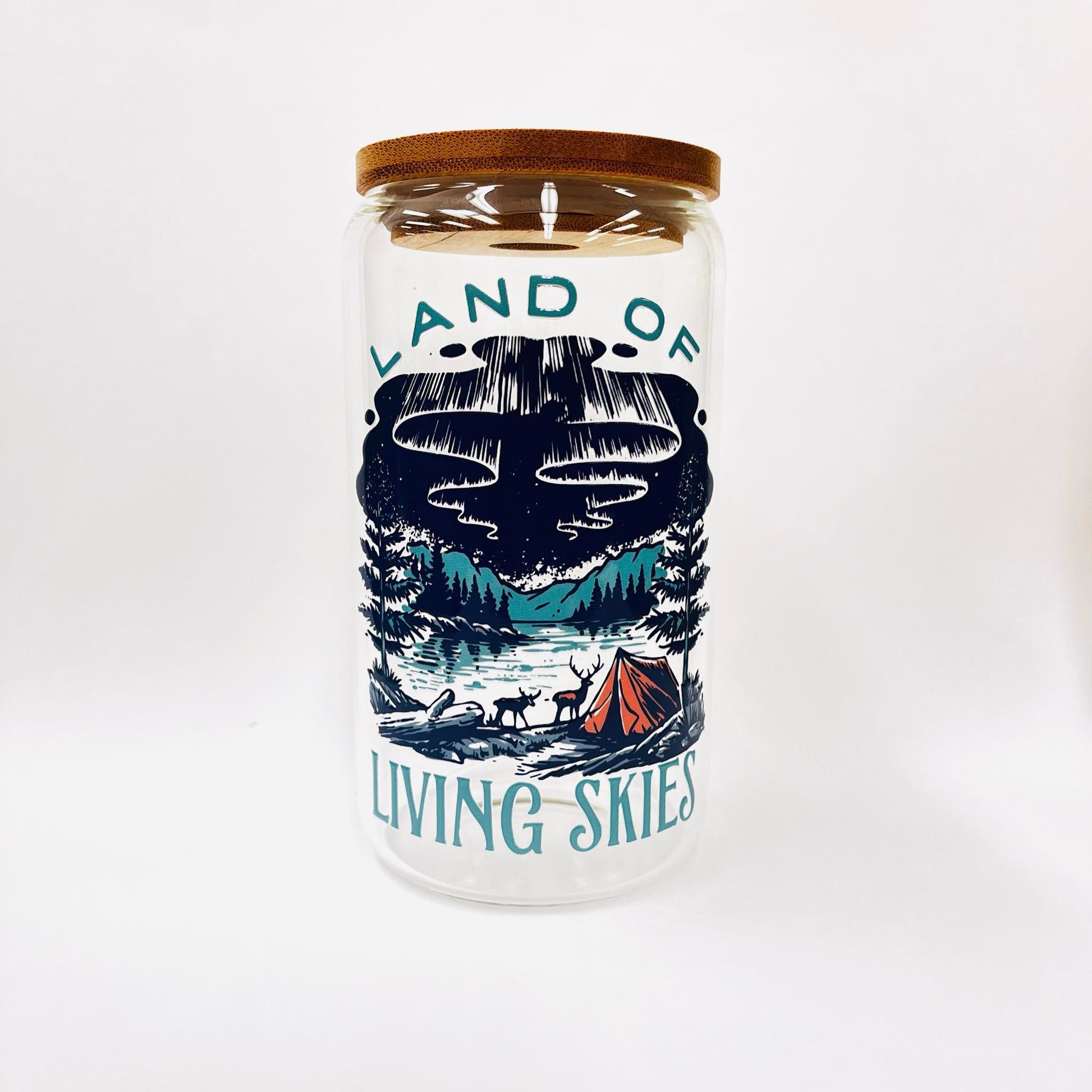 Drink in the beauty of the Northern Lights with our Libbey glass featuring a camp sight and the phrase "land of living skies". Perfect for adding a touch of whimsy to your drinks!